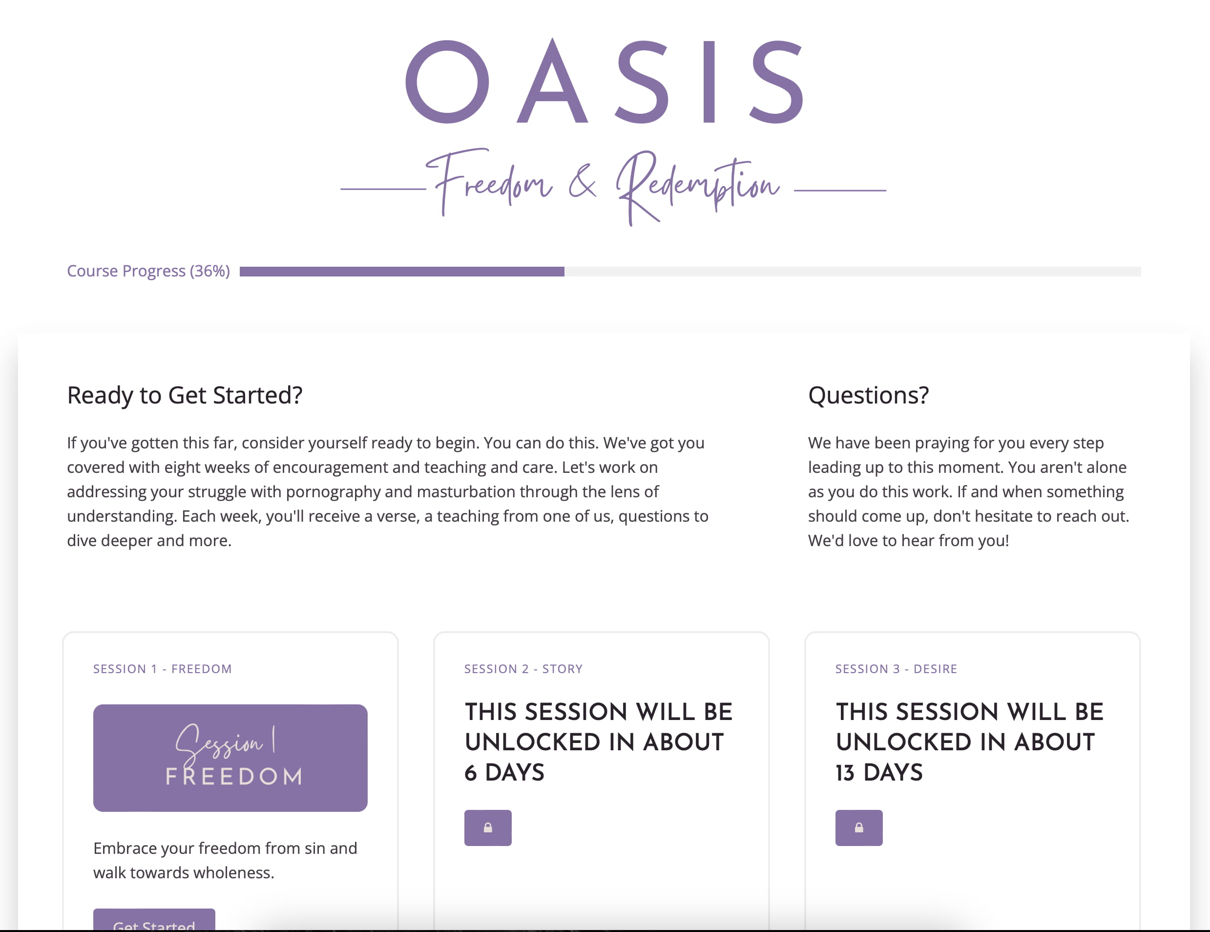 So succumbing to temptation in a moment, and even multiple moments, is no longer a pattern – it’s just a series of moments. And with Oasis you’ll have to tools to respond to those moments with intention and from a place of intimacy and alignment with God – instead of isolation and shame.